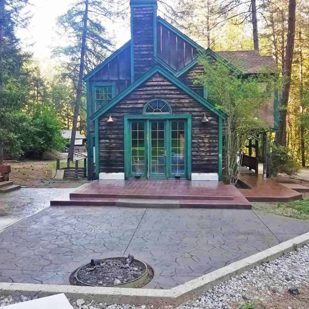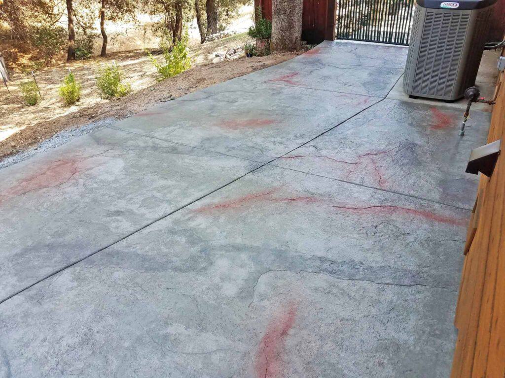 This patio area was created with a Roman Slate random stone stamp pattern with gray base color and green accent top colors.