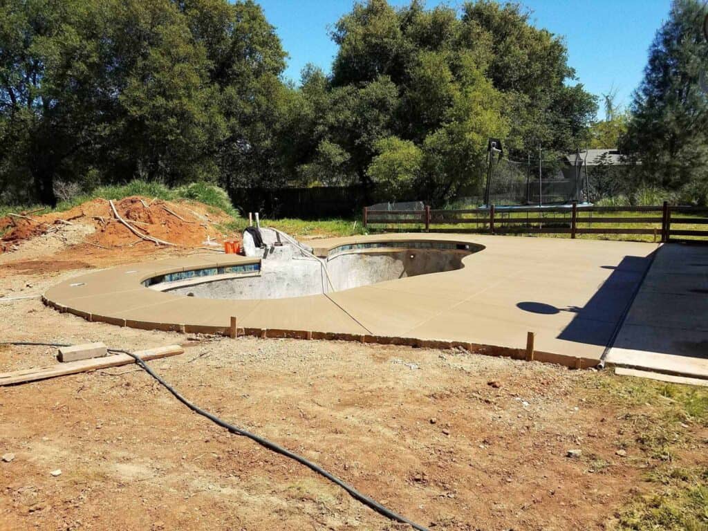 Concrete pool deck with a buckwheat tan base color.