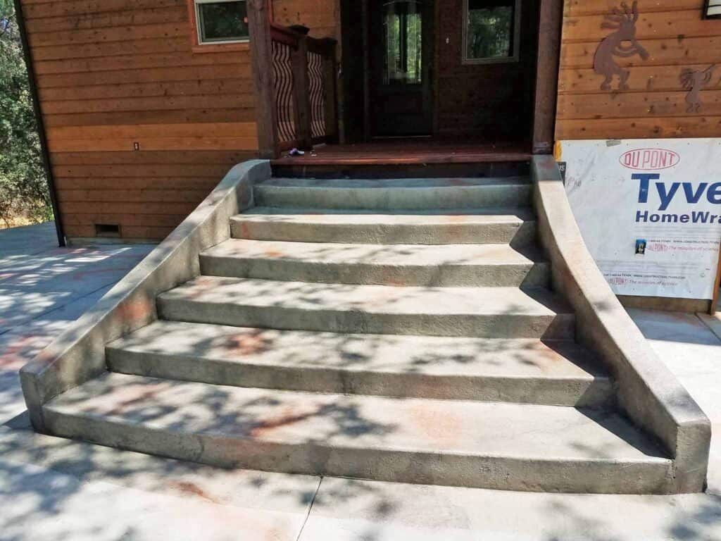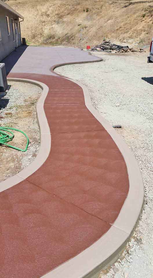 Here you see a staircase with retaining walls on each side and slate skin stamp pattern with red accents.